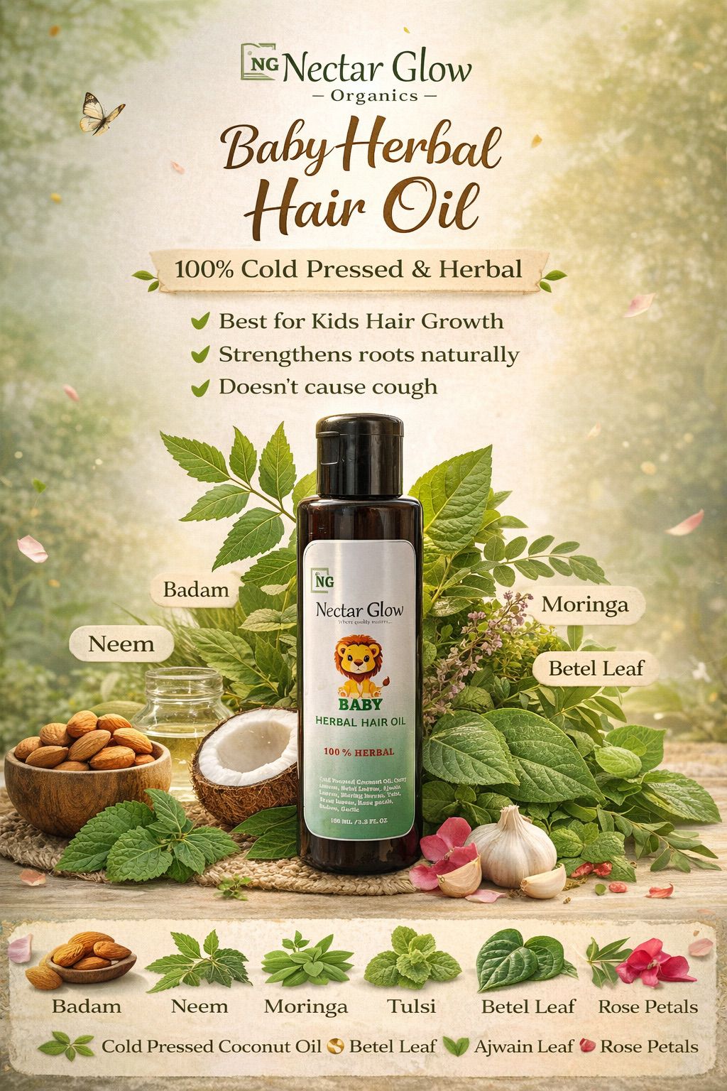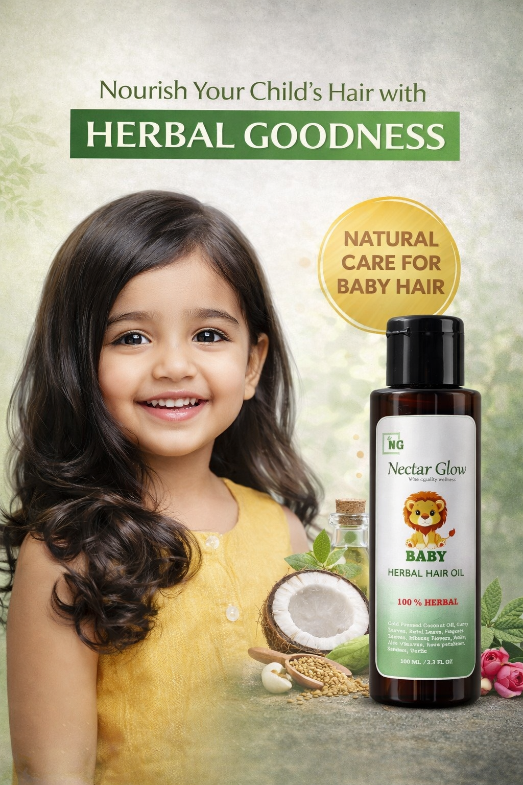 Free from mineral oil, parabens, artificial fragrance, and harsh chemicals, Nectar Glow Baby Herbal Hair Oil ensures pure, loving care for your little one.